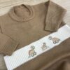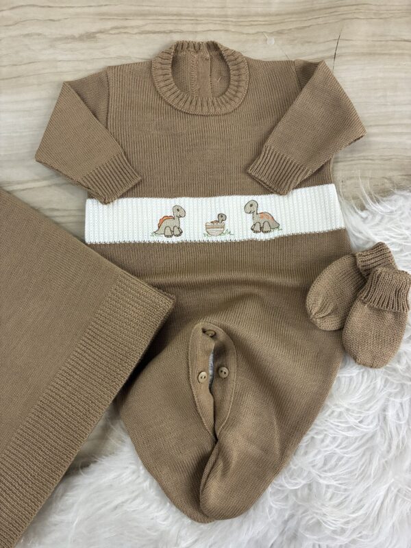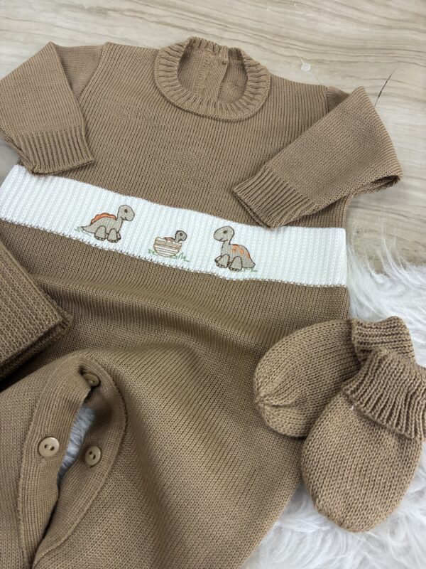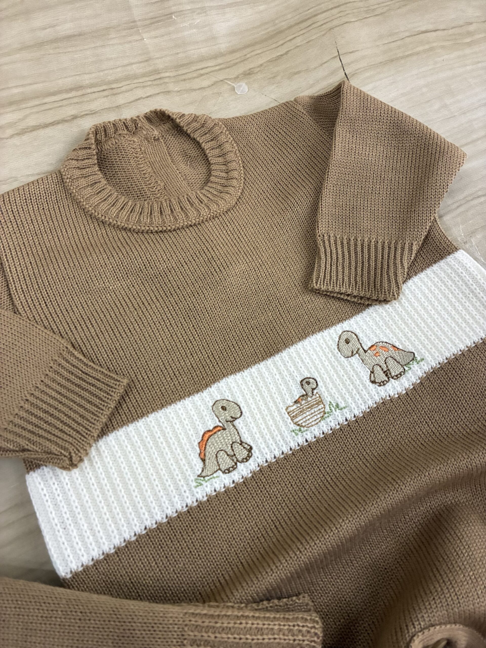 Macacão em tricô verde erva-doce, com bordado de dinossauros fofinhos e abertura prática com botões
