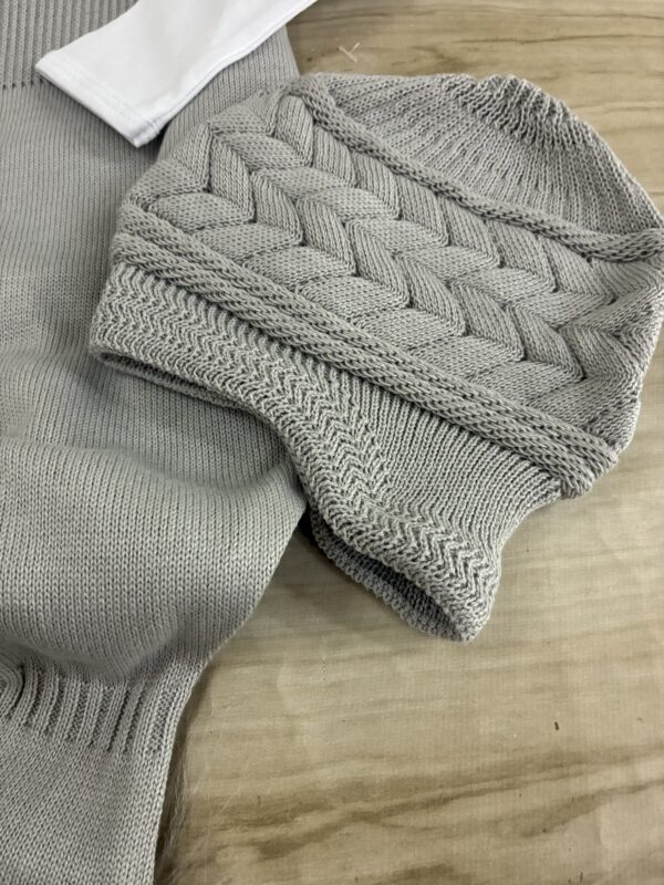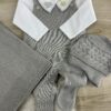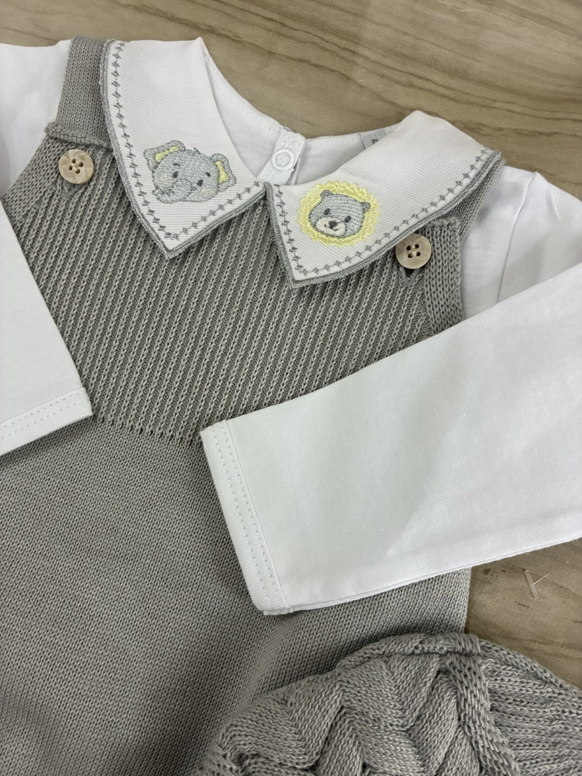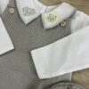 O macacão em tricot azul jeans  com  body de gola e punhos em tecido branco une delicadeza e conforto, ideal para ocasiões especiais.