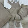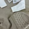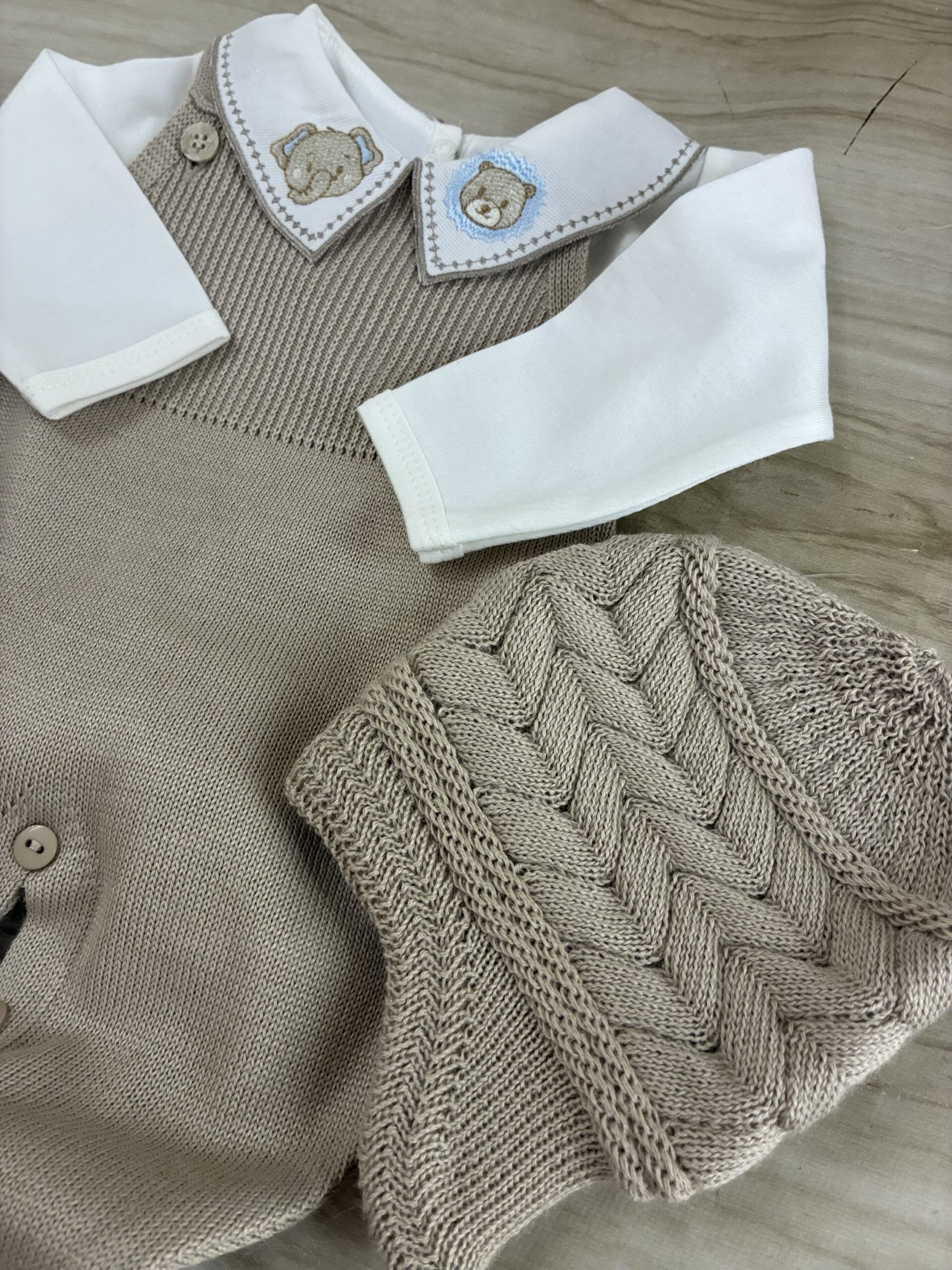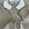 O macacão em tricot azul jeans com body de gola e punhos em tecido branco une delicadeza e conforto, ideal para ocasiões especiais.