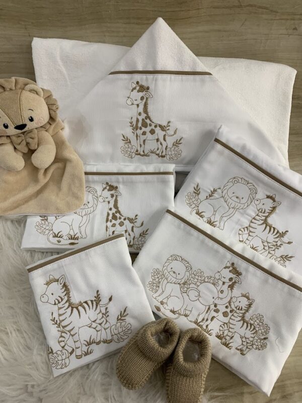 Nosso Kit Banho é confeccionado com fraldas cremer, bordadas com bichinhos safari em tons suaves, proporcionando suavidade e charme ao enxoval do bebê.