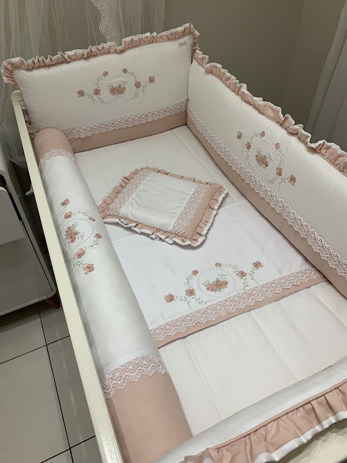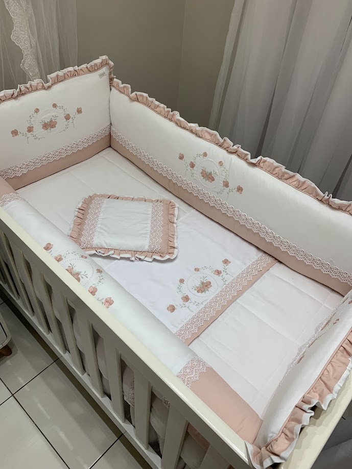 Um kit berço encantador, com bordados delicados e acabamento em guipir e babados, perfeito para deixar o quartinho ainda mais acolhedor e elegante.