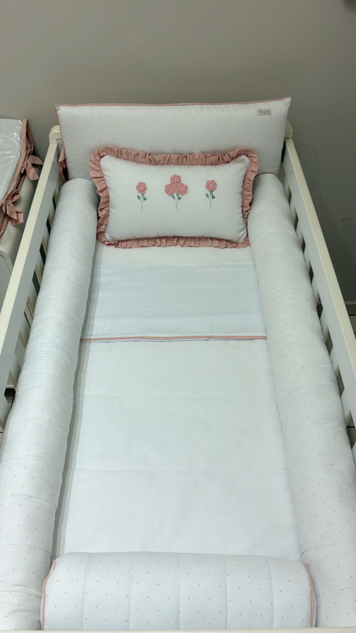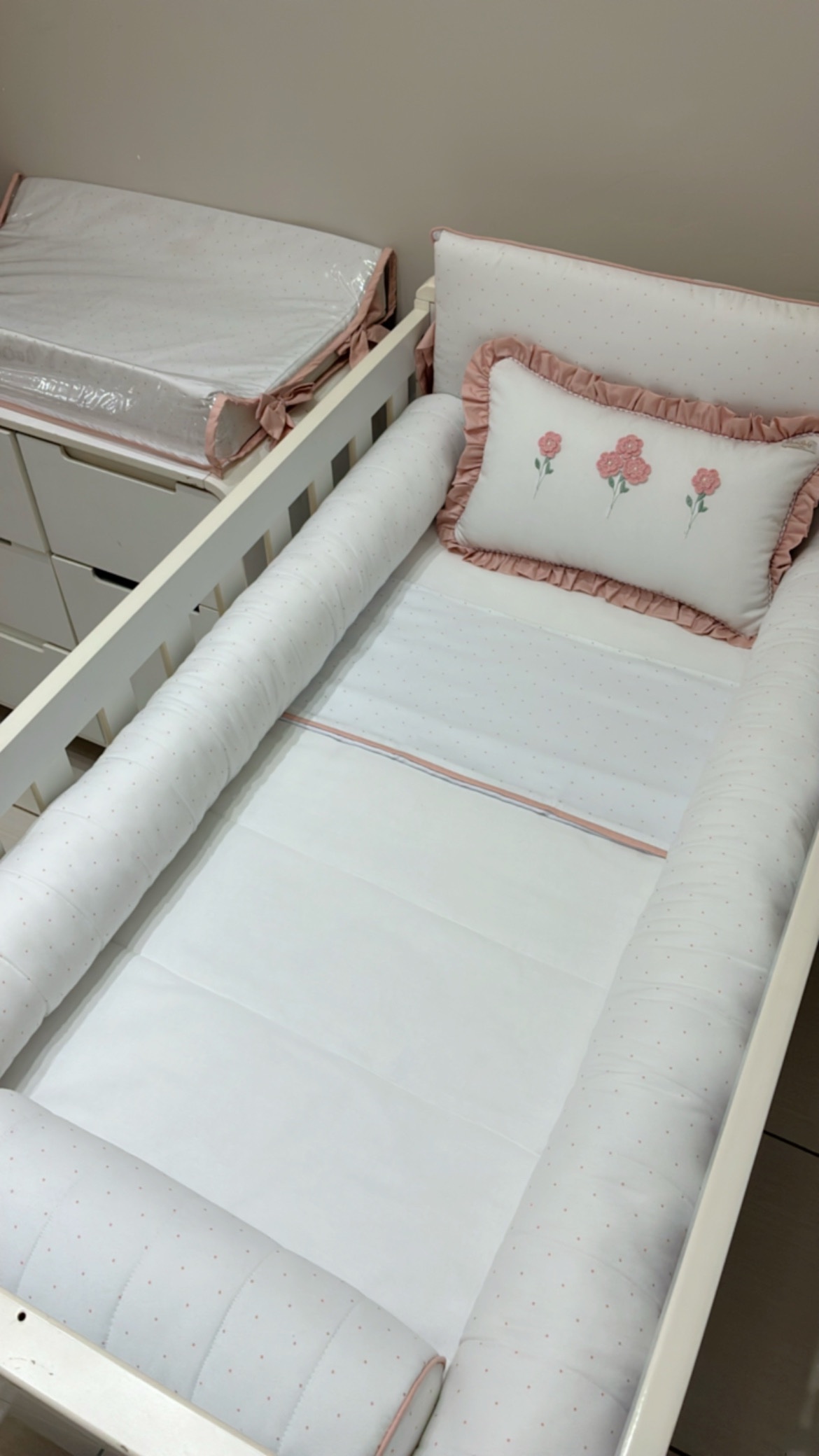 Confeccionado em tecido de alta qualidade, com estampa poá rosê suave, ele transforma o bercinho em um espaço acolhedor, seguro e cheio de charme para o bebê.
