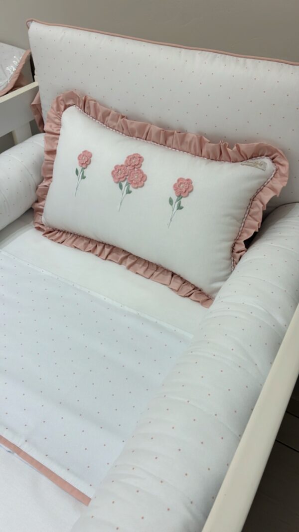 A almofada extra em bordado floral com babadinhos rosê é vendida separadamente.