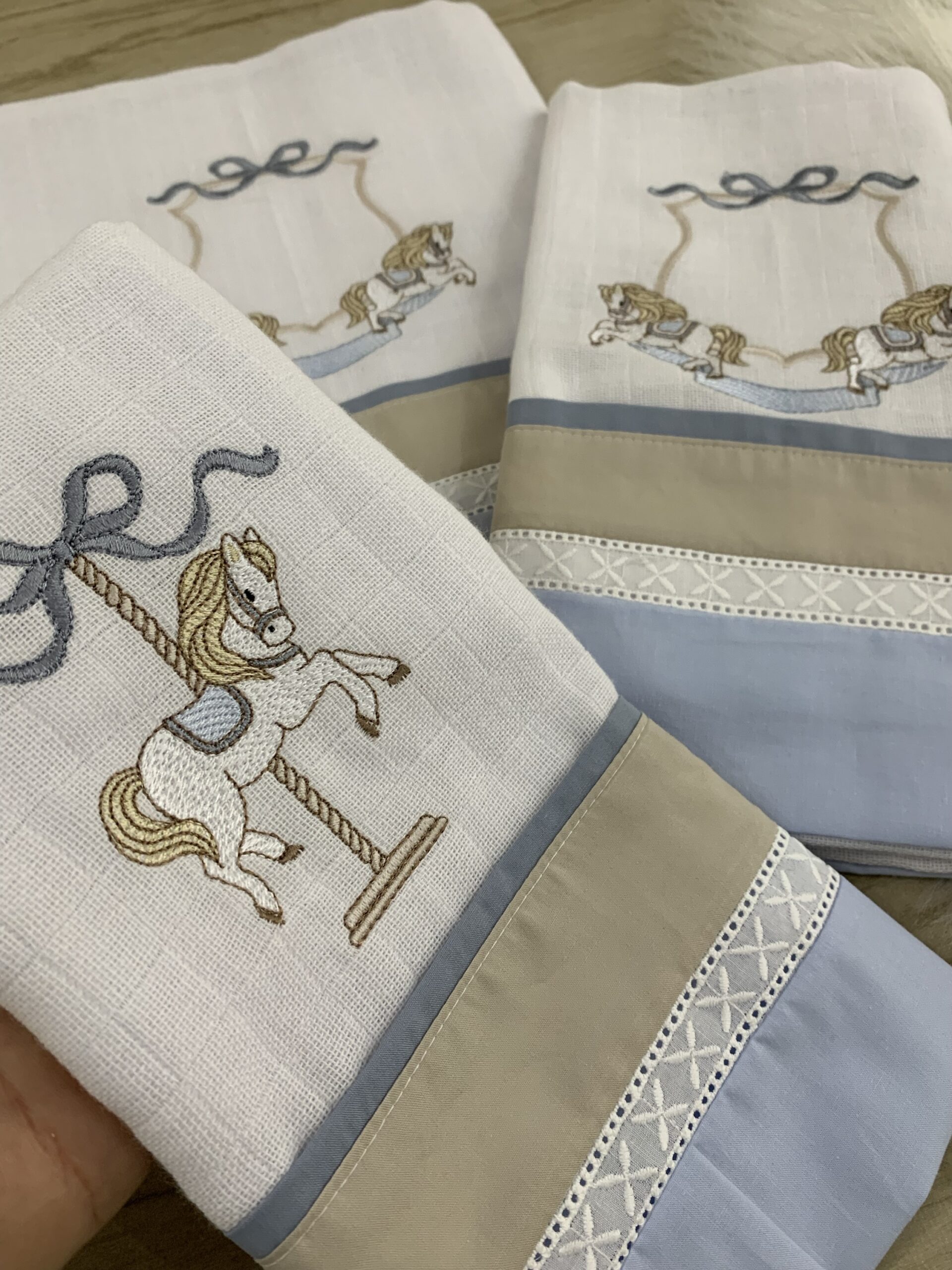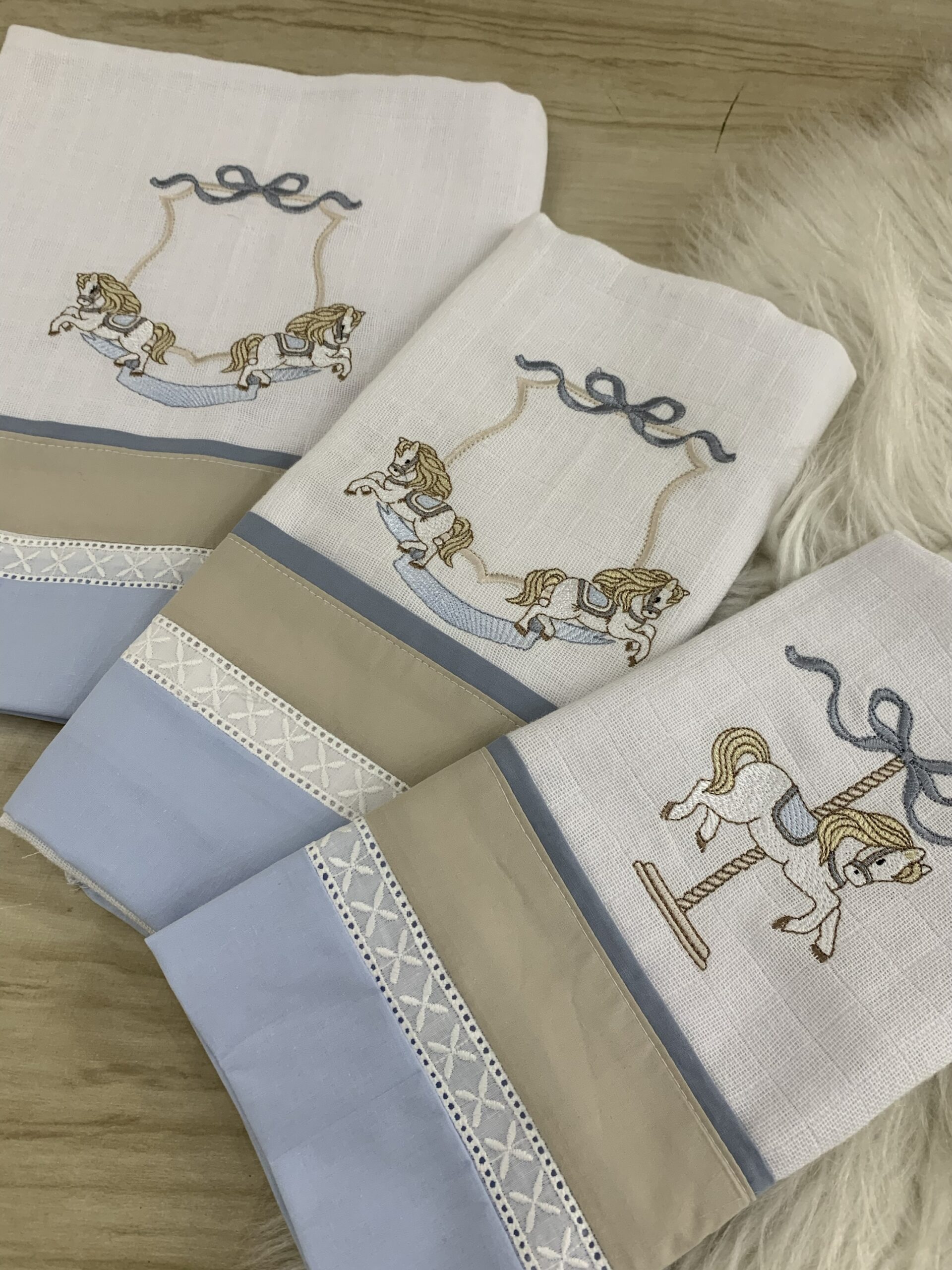 cada peça recebe bordado exclusivo com tema, acabamento em barra de tecido de algodão, garantindo um toque sofisticado e encantador.