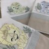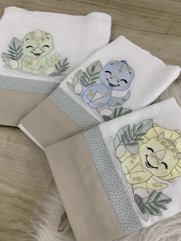 cada peça recebe bordado exclusivo com tema, acabamento em barra de tecido de algodão, garantindo um toque sofisticado e encantador.