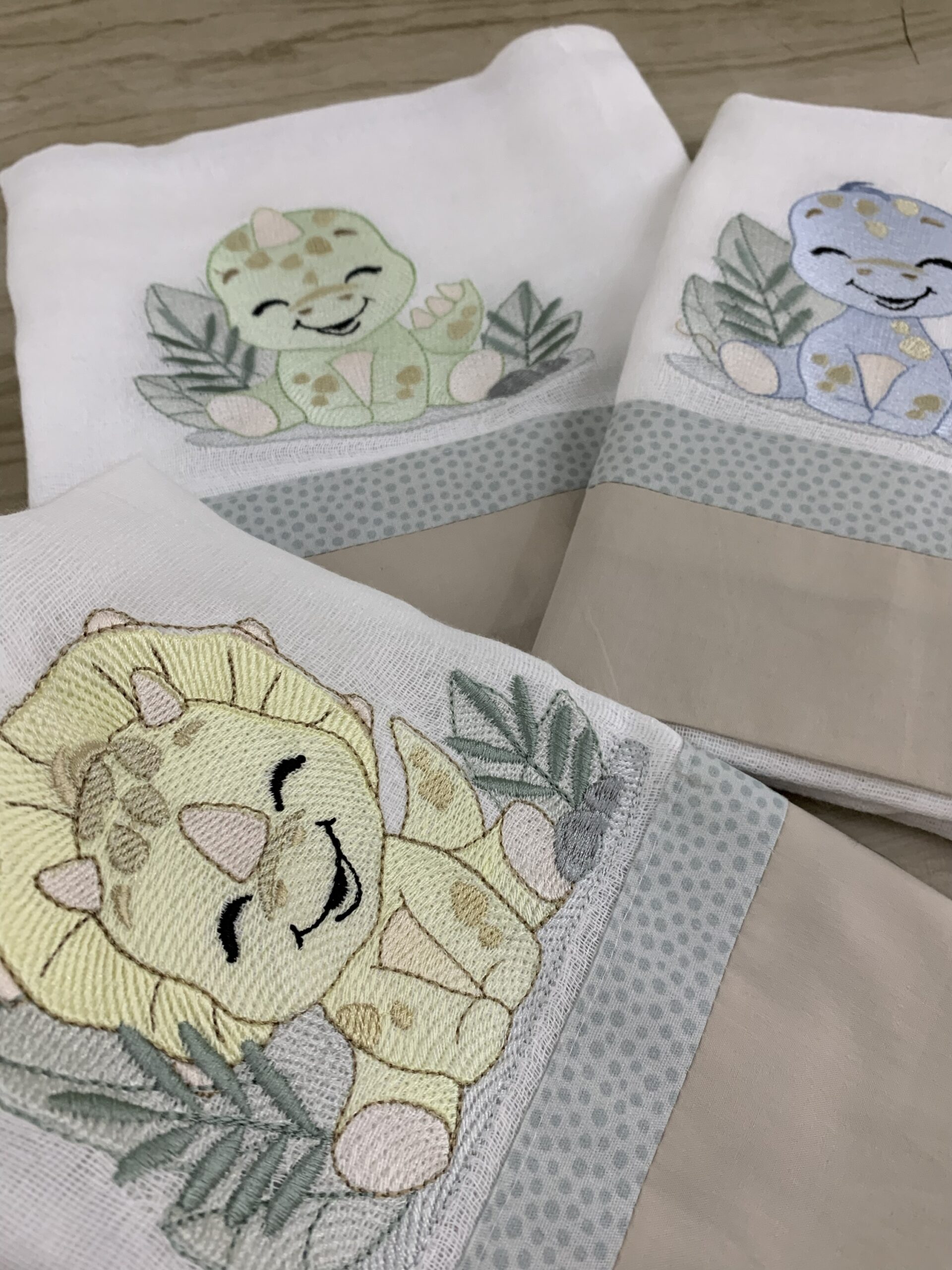 cada peça recebe bordado exclusivo com tema, acabamento em barra de tecido de algodão, garantindo um toque sofisticado e encantador.