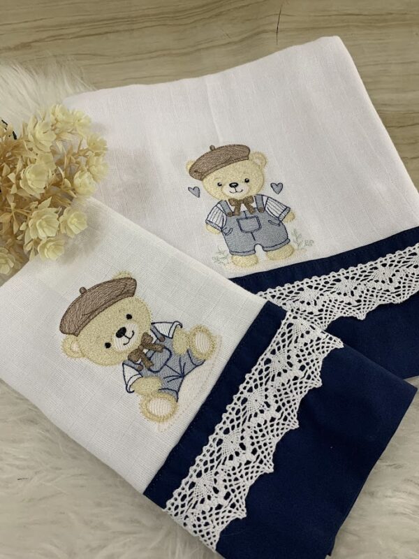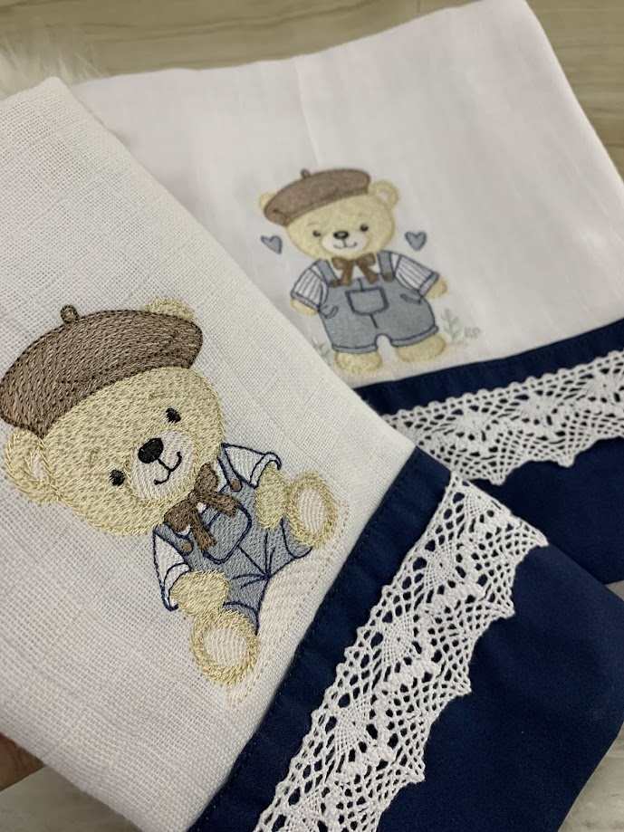 Composto por 1 fralda de passeio 70 x 80  e 1 fralda de boca 35 x 40,