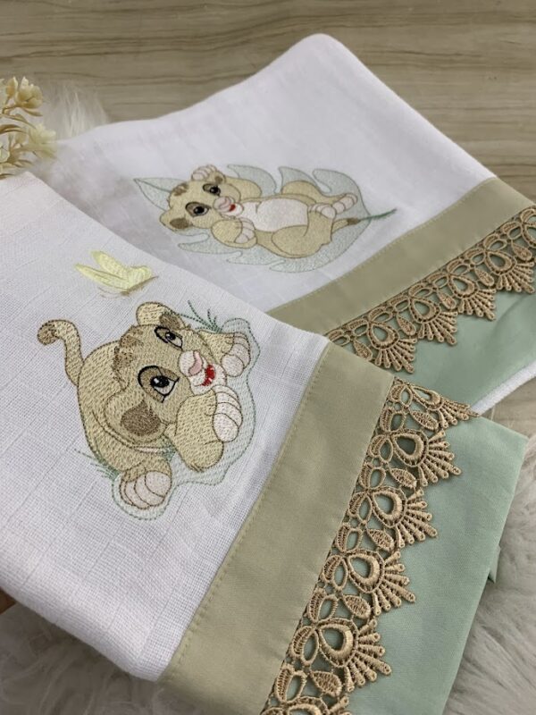 Composto por 1 fralda de passeio 70 x 80 e 1 fralda de boca 35 x 40,
