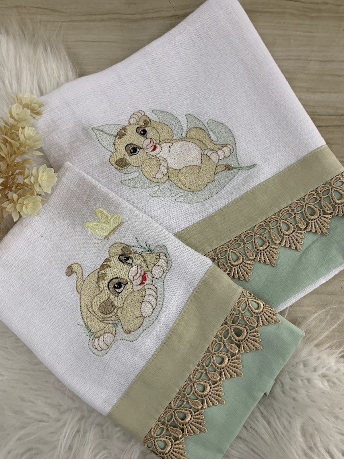 Composto por 1 fralda de passeio 70 x 80 e 1 fralda de boca 35 x 40,